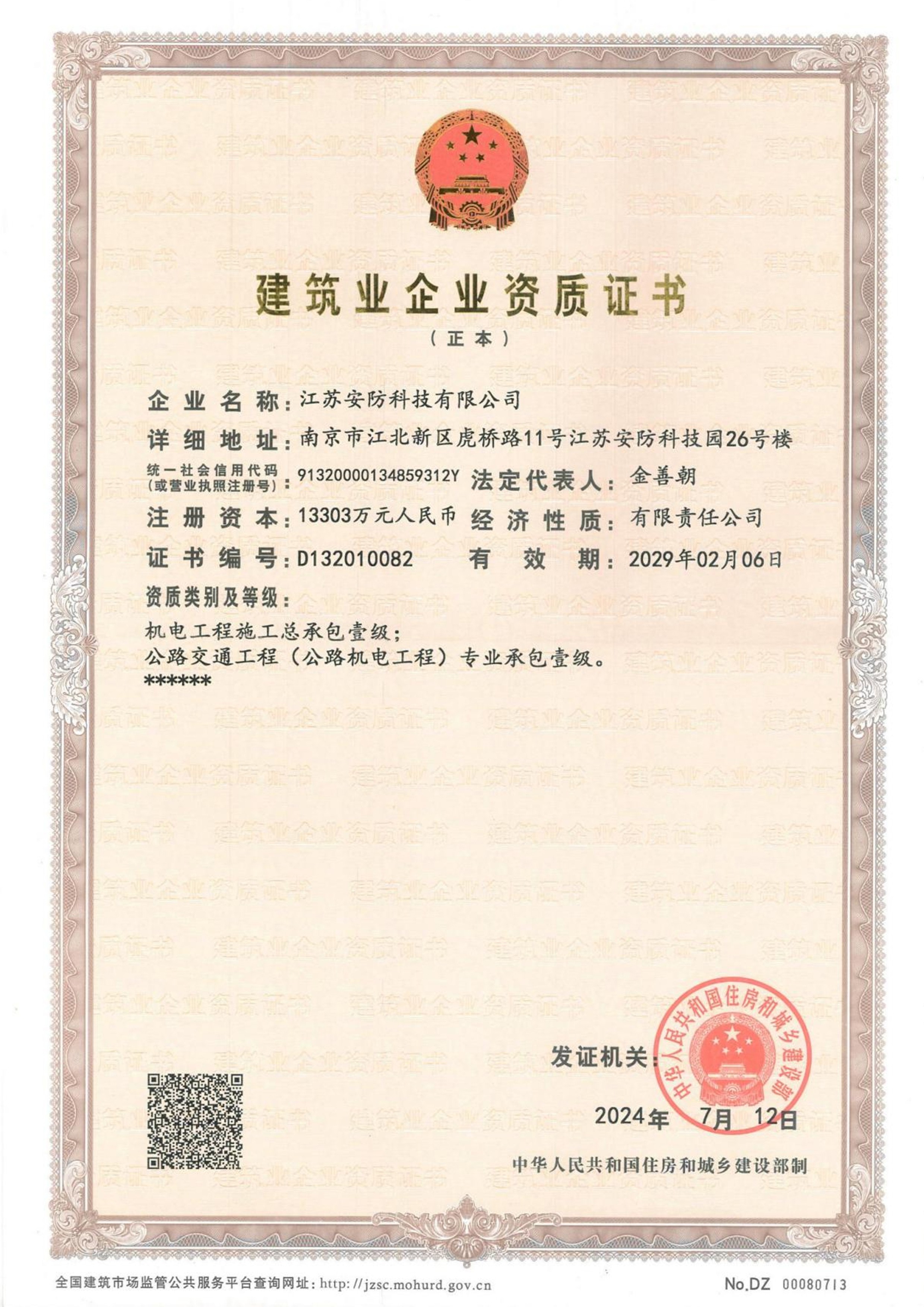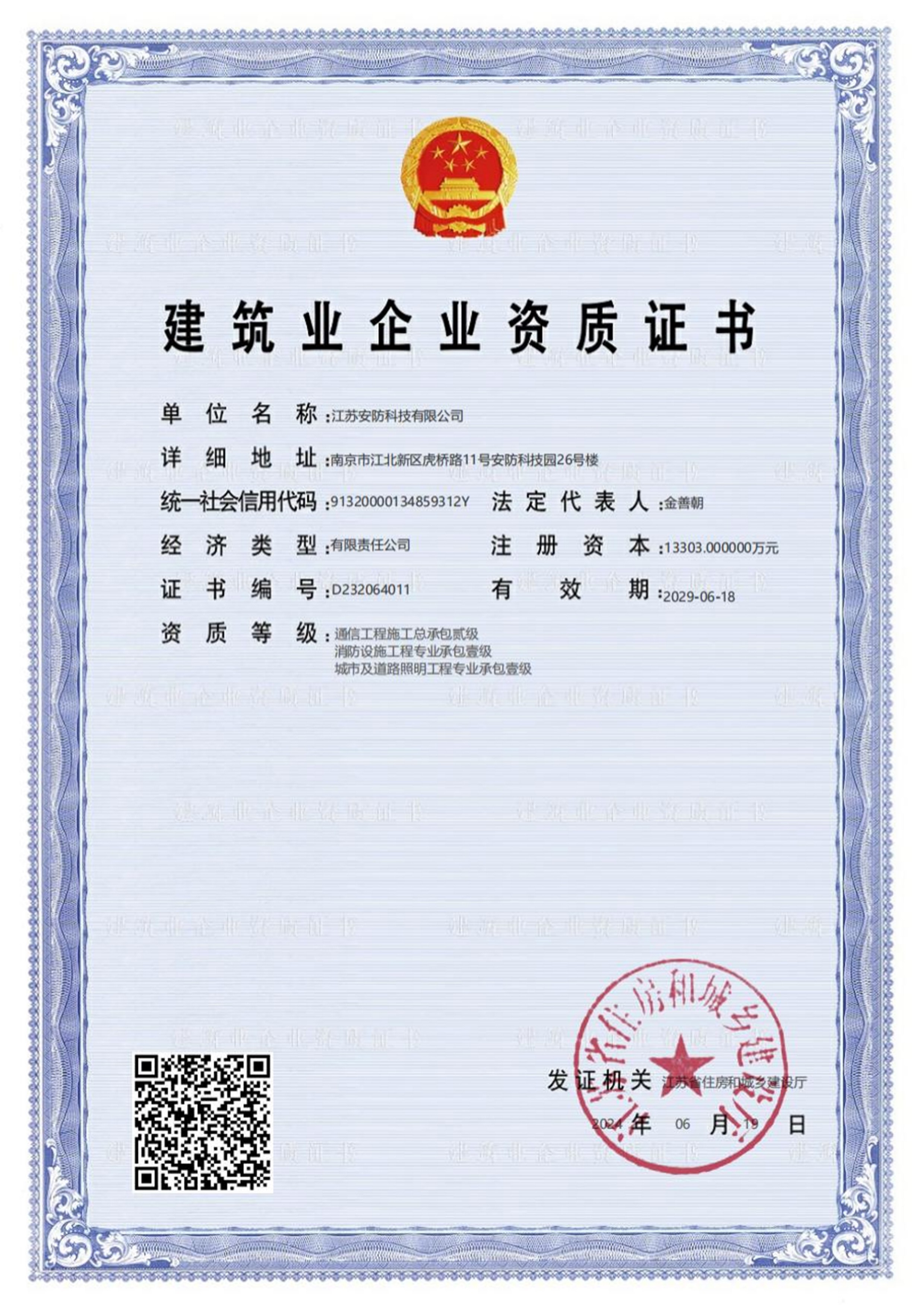通信工程施工总承包贰级、消防设施工程专业承包壹级、城市及道路照明工程专业承包壹级