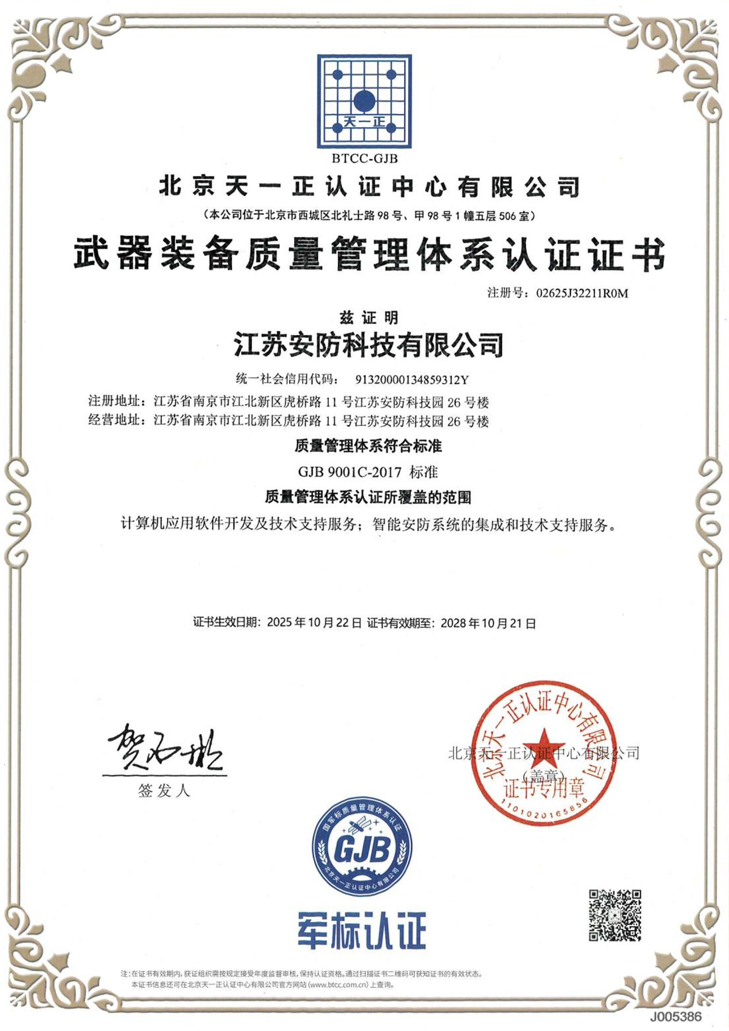武器装备质量管理体系认证证书(GJB9001C-2017)